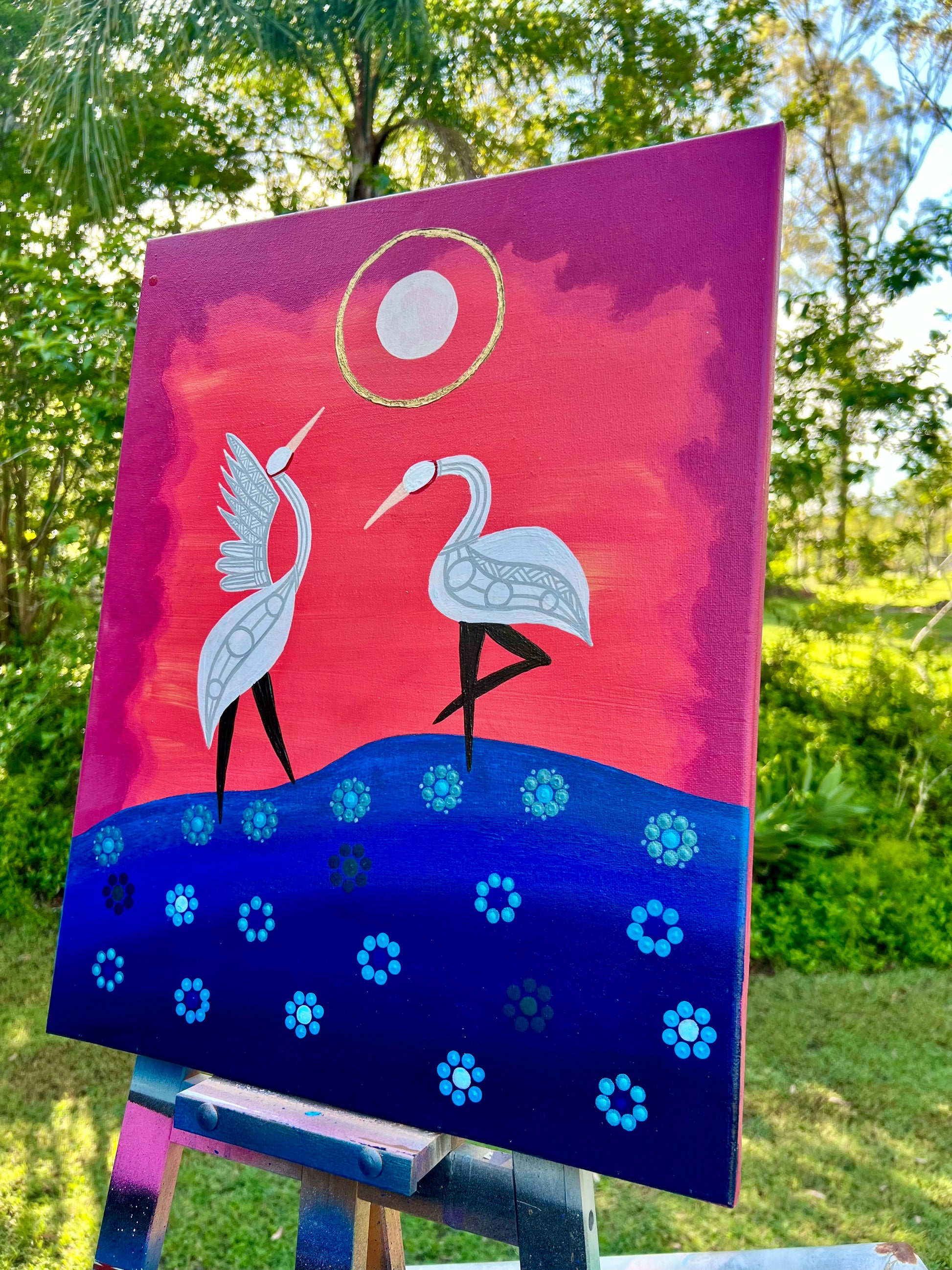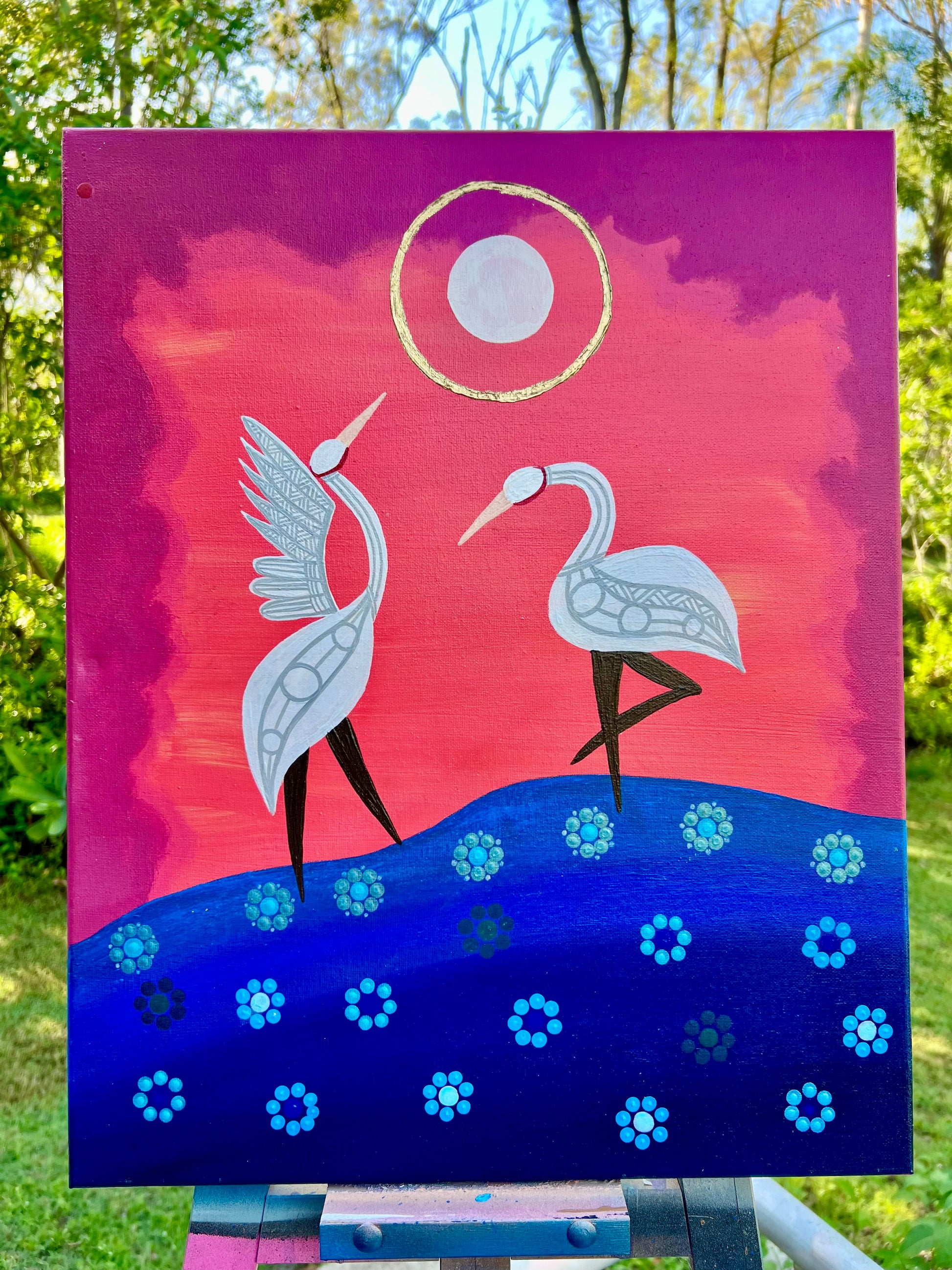 "Two Brolgas dancing under a full moon".