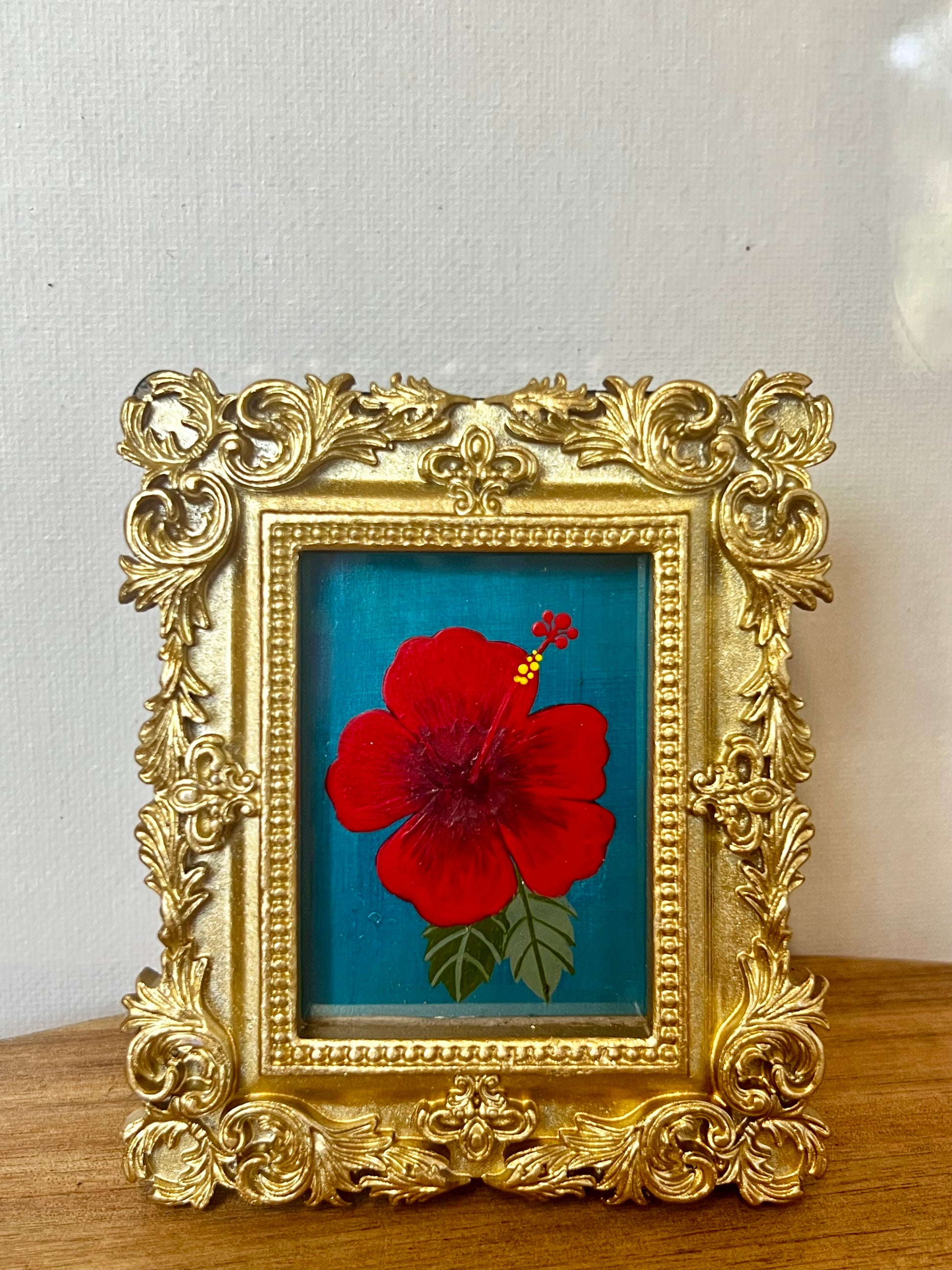 Add a bold pop of colour to your space with this hand-painted mini original, set in a gold ornate frame with a built-in stand.