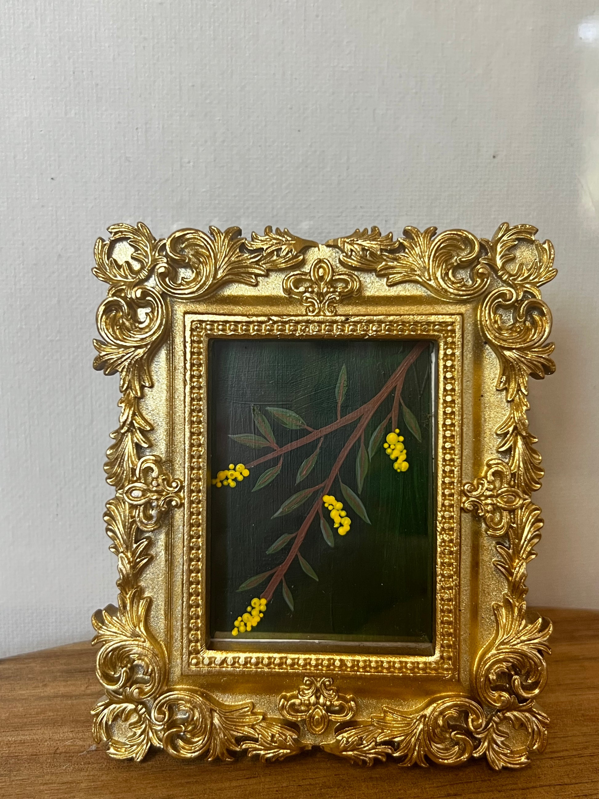 Add a bold pop of colour to your space with this hand-painted mini original, set in a gold ornate frame with a built-in stand.